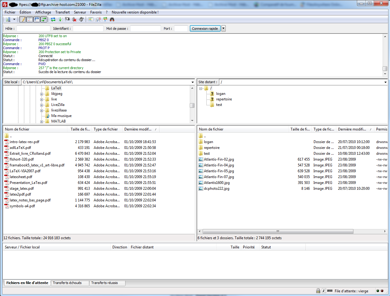 Le FTP (Files Transfer Protocol ou Protocole de Transfert de Fichiers) vous permet de transférer simplement vos fichiers vers le dossier "Mes Fichiers FTP". Ce dossier est à part de votre compte, non accessible directement depuis Internet. Vous pouvez ajouter dans ce dossier tous vos documents, peu importe son type et sa taille (dans la limite de votre espace disque). Vous pouvez envoyer des centaines de fichiers sans problèmes, des dossiers, des arborescences. Le FTP permet de faire des pause et de reprendre les transferts et gère les coupures de connexion le tout avec barre de chargement, temps restants et vitesse d'envoi.